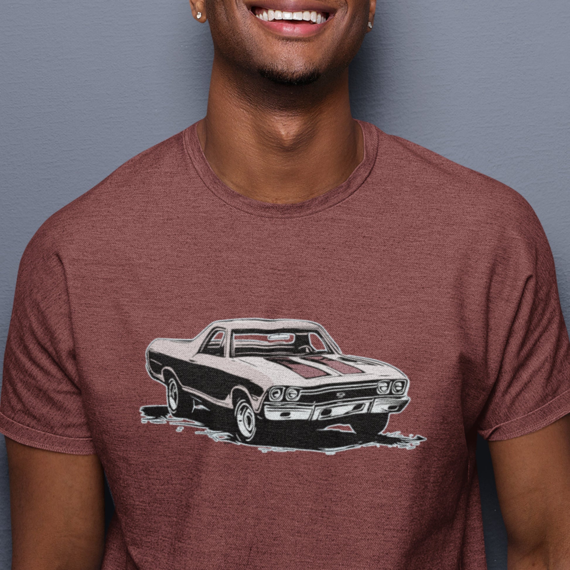 This shirt features a red 68 El Camino - It's the classic car shirt for the vintage Chevy fan!