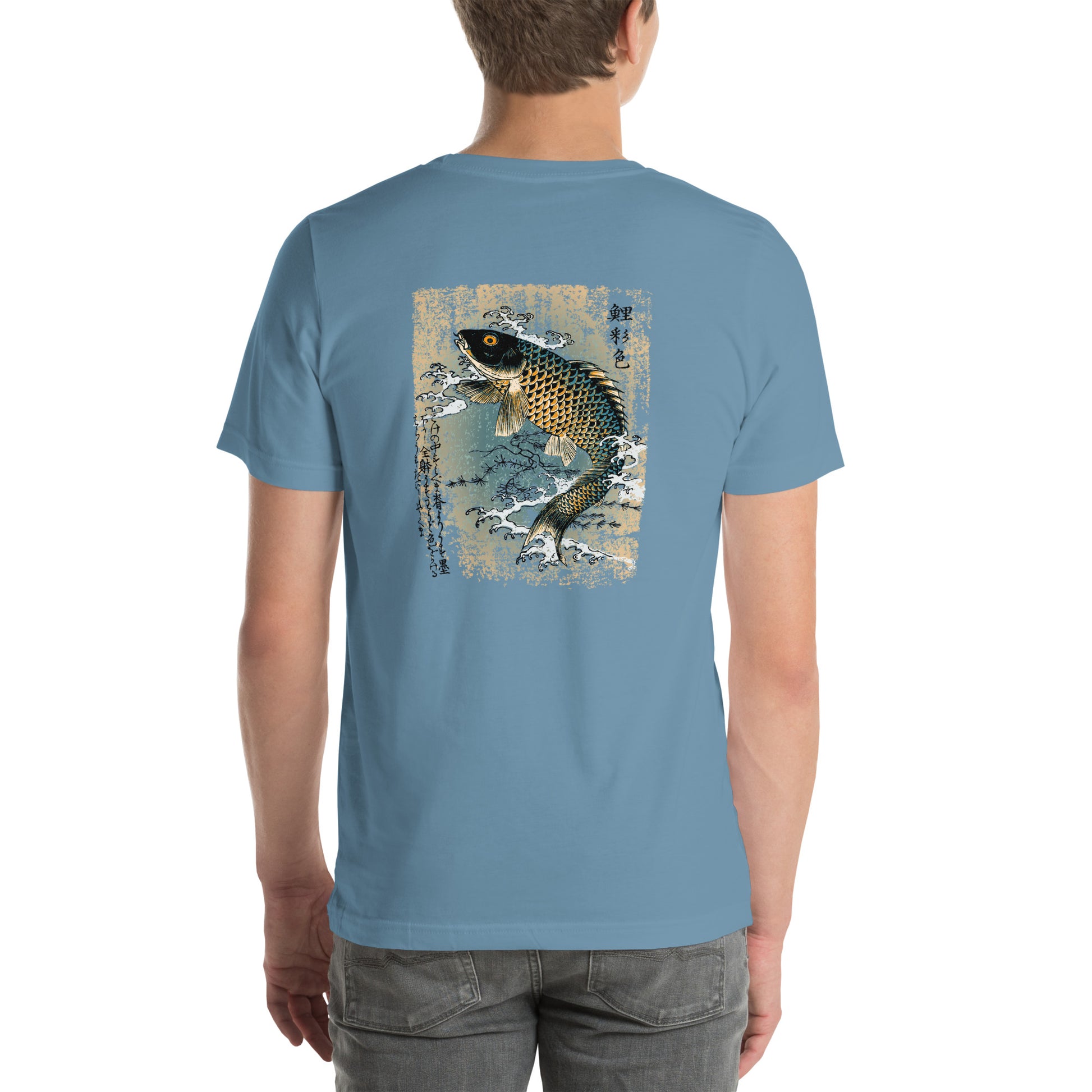 This shirt features a fish drawing ( on back of shirt ) from Utagawa Hiroshige's 'Picture Book for the Practice of Drawing Fish' (1849). It appears to be a carp or koi fish.